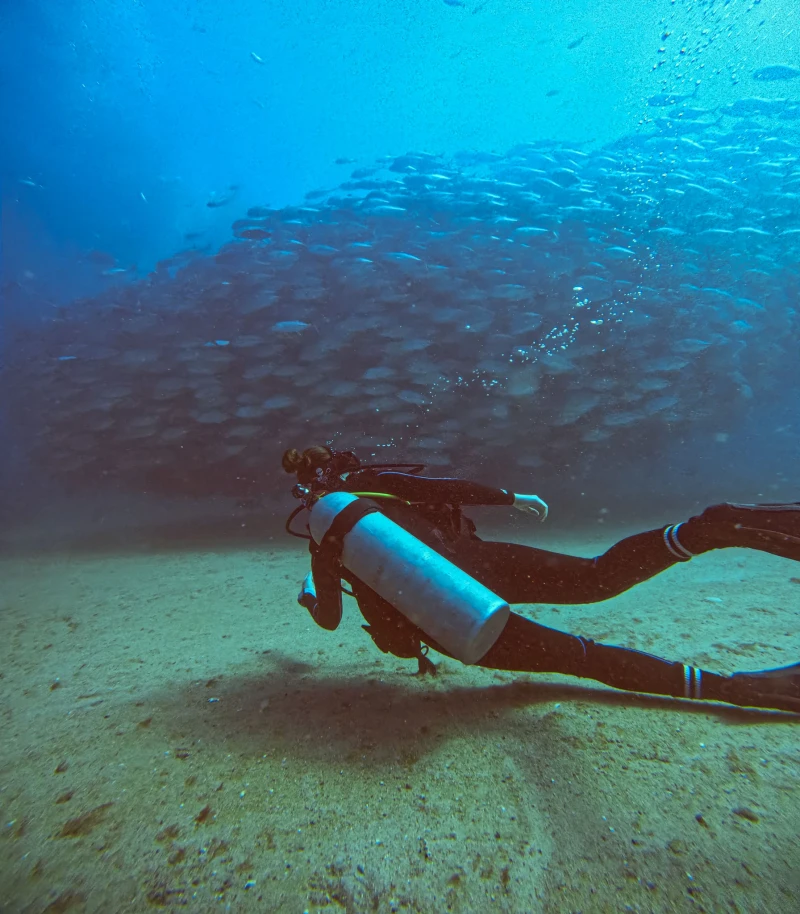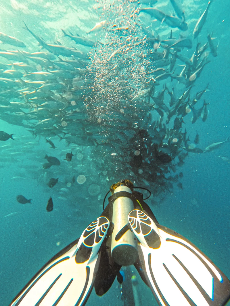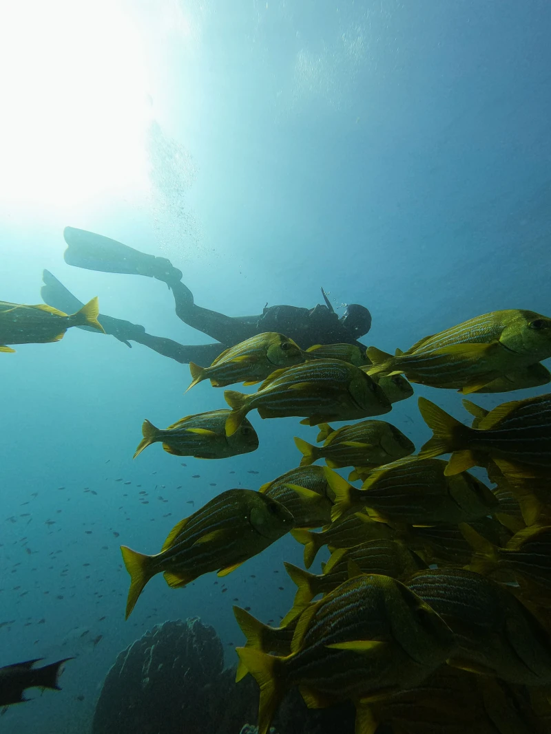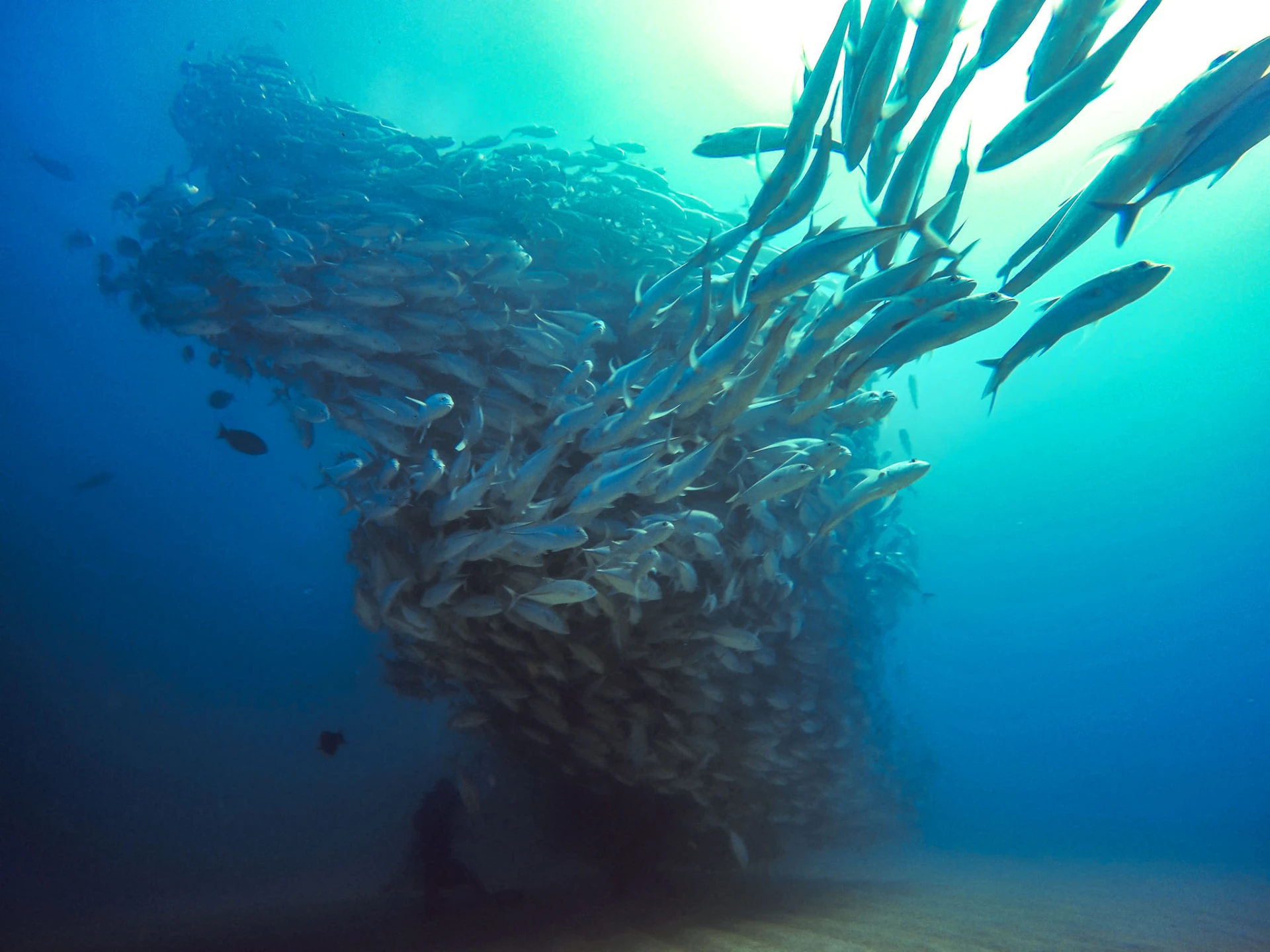 En Cabo Pulmo, un arrecife protegido y vibrante, te rodean enormes cardúmenes que cubren la vista como murallas vivientes, junto a tiburones, tortugas, delfines y mantas gigantes que hacen de cada buceo un espectáculo.