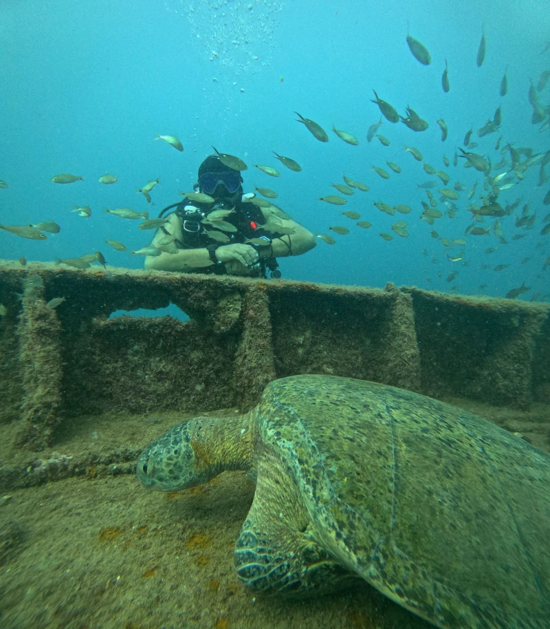 Bucear en Cabo Pulmo es adentrarse en un santuario marino único: el barco hundido El Vencedor, cubierto de vida y visitado por tiburones toro; los pináculos de Los Morros y El Bajo, donde enormes cardúmenes de jureles, rayas y tiburones forman escenas de película; y arrecifes como La Esperanza y Las Casitas, vibrantes de corales y peces tropicales. En La Paz, la experiencia se vuelve aún más mágica: en Isla Espíritu Santo los lobos marinos juguetones nadan a tu alrededor; en el arrecife Swanee Reef, la vida macro y los corales coloridos ofrecen un espectáculo cercano y detallado. Fang Ming: hundido en 1999, es un carguero chino de más de 50 metros, famoso por estar habitado por tortugas verdes y cardúmenes de pargos.