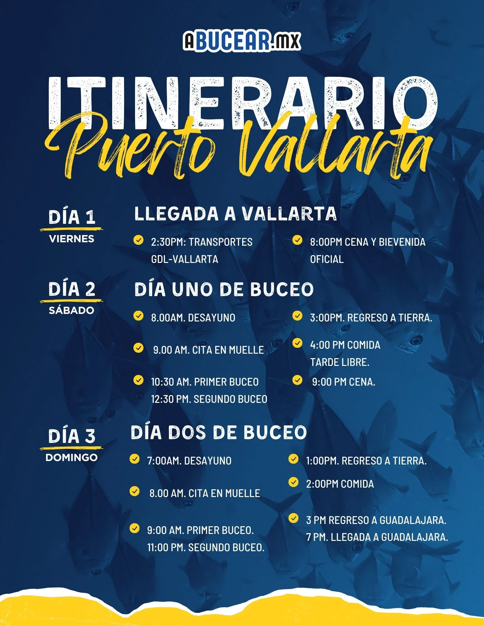 Puerto Vallarta cuenta con sitios para todos los niveles, desde buzos en formación hasta inmersiones avanzadas o técnicas. Dentro de la bahía podemos encontrar sitios muy amigables con una gran variedad de biodiversidad tropical, y fuera de ella, grandes formaciones rocosas profundas con avistamientos de vida pelágica.